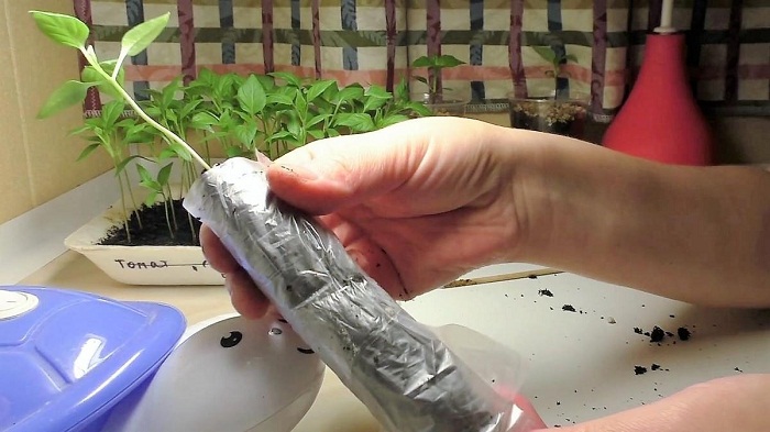 С помощью пелёночного способа очень просто выполнять пикировку молодых растений. Берут рулон с уже проросшими саженцами в стадии, когда требуется пикировка, и осматривают с какой стороны находятся корни. От этого уровня отсчитывают около 2-3 см и прищипывают корни. Верхний слой полиэтилена обязательно снимают, а росток в туалетной бумаге высаживают в отдельную емкость.