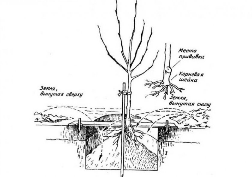 Размеры ямы подбираются на основании размеров корневой системы молодой особи, в распрямленном виде корни должны свободно помещаться в лунку. Глубина чаще всего не превышает полуметра, а ширина – метра. На дно подготовленной лунки засыпают смесь компоста, торфа и плодородной почвы, а на полученный холмик выставляют саженец. Также требуется колышек.