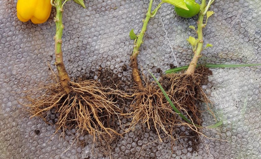 Перец имеет разветвлённый стержневой корень, который входит в землю на глубину от 70 см до 1 метра при посеве семенами в открытый грунт и до 40 сантиметров — при посадке рассадным способом. Корни имеют низкую восстановительную способность, которая уменьшается по мере увеличения возраста рассады. На рост корней влияет влажность (сухость) почвы, количество тепла, освещённости и другие факторы. Большая часть корней расположена близко к поверхности земли, поэтому нужно крайне осторожно рыхлить почву возле прикорневого ствола растения.