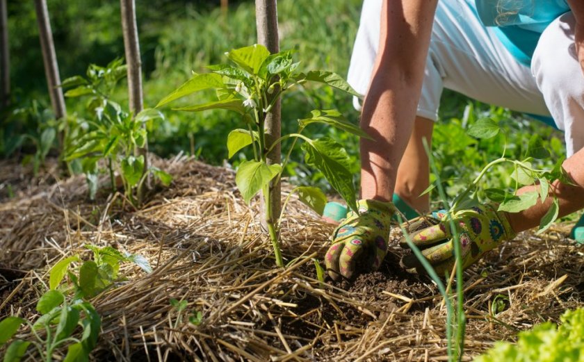 Полезно мульчировать перец перепревшей соломой — слой около 10 см, благодаря чему можно сократить частоту поливов, сведя их до раза в 9-10 дней. Своевременный уход за растениями перца заключается и в подвязке растений. Производить подвязку необходимо после окучивания и мульчирования.