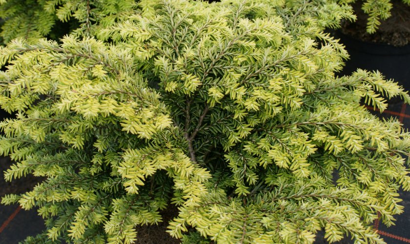 «Wintergold». Один из редких сортов с золотистой хвоей. Элегантное пирамидальное дерево высотой около 2 метров. Золотистый оттенок хвоя приобретает в октябре и остается в таком цвете до апреля. Для яркости окраса место для посадки тсуги данного сорта выбирайте солнечное.