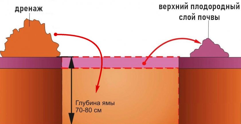 При выкапывании ямы верхний слой почвы необходимо откинуть отдельно. Эту землю смешивают с небольшим количеством компоста, торфа и песка, что позволяет увеличить ее дренажность. На дно подготовленной ямы слоем в 15 см следует уложить керамзит либо крупнозернистый песок.