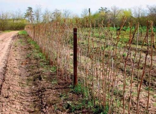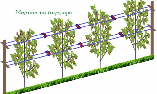 Малинник, посаженный в траншеи, требует шпалерной подвязки. Шпалеру натягивают на столбы, установленные по краям ряда по обе стороны кустов. По мере роста саженцев, ряды шпалеры постепенно добавляют.
