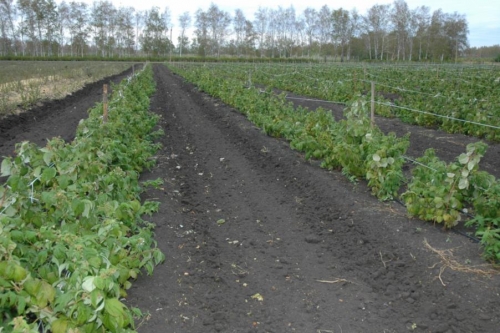 - Ленточный – посадка саженцев проводится в траншеи, соблюдая расстояние между рядами 1,5-2 м, расстояние в ряду – 30-50 см. Возможна двухстрочная посадка в траншеи с расстоянием между строчками 30 см. По всей длине ряда натягивают проволоку или шпагат, к которым будут подвязаны будущие кусты. Такой способ считается более удачным для посадки.