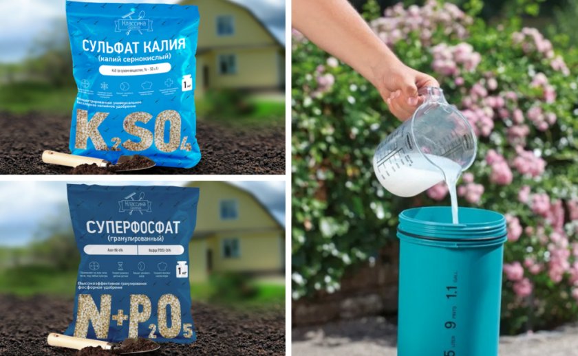Для приготовления питательного состава нужно в 10 л воды растворить по 1 ст. л. суперфосфата и сульфата калия.