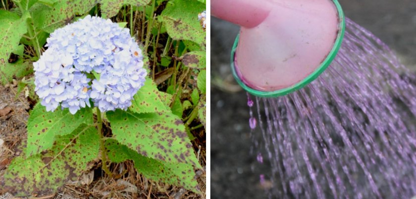Раз в месяц рекомендуется поливать растение бледно-розовым раствором марганцовокислого калия для укрепления структуры тканей растения. Им же можно опрыскивать листья. Жидкий навоз также полезен для гортензии во время всего сезона.