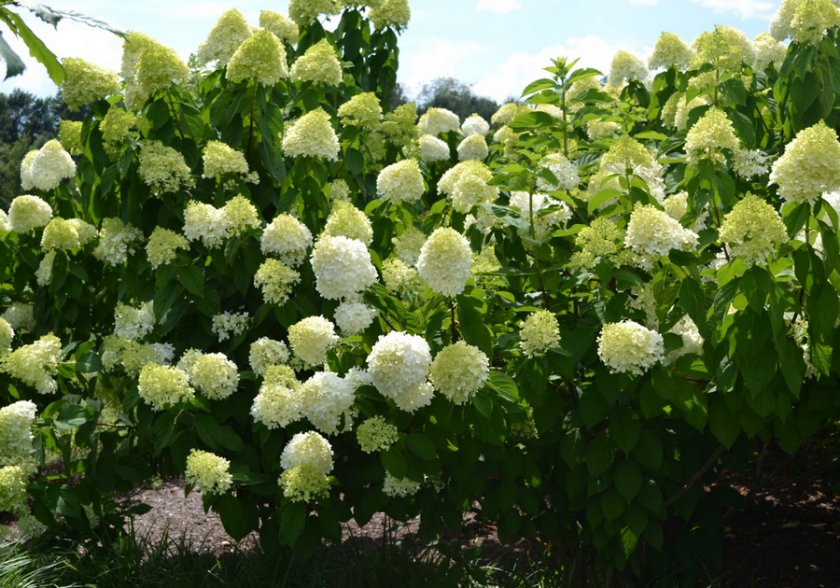 От других видов гортензий метельчатая отличается конусовидной формой соцветий, высота которых может превышать 20-25 см. Метелка состоит из бесплодных и плодущих цветков. Стерильные четырехлепестковые цветки – крупные (25-30 мм), формируют плотное, пышное соцветие и декоративный вид всего куста. Цвет (розовый, зеленый, белоснежный) зависит от сорта. Фертильные цветки более мелкие, завязывают семена. Гортензия – прекрасный медонос.