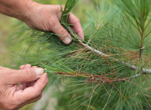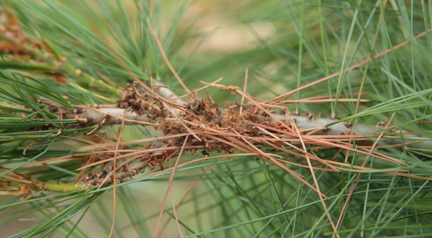 - Немедленно удалите с сосен повреждённые почки и ветки.