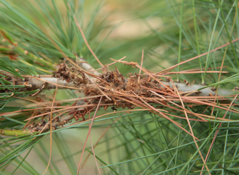 На фото: повреждение побега сосны личинками красноголового пилильщика