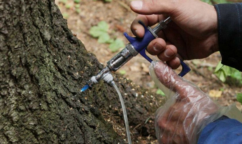 Процедура подразумевает введение инсектицида непосредственно в ходы жуков, которые располагаются в коре дерева.