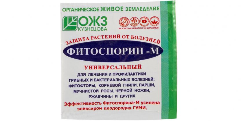 - «Фитоспорин-М» — микробиологический препарат, созданный на основе бактерий, которые активизируются при взаимодействии с водой. Порошковый препарат разводят в воде комнатной температуры 1:2 и выдерживают 1 час, чтобы дать бактериям активизироваться. Препарат, выпускающийся в жидком виде, не нужно разводить, он сразу готов к использованию. Опрыскивание по листьям и почве проводится единоразово. Срок действия бактерий — 2-3 года.
