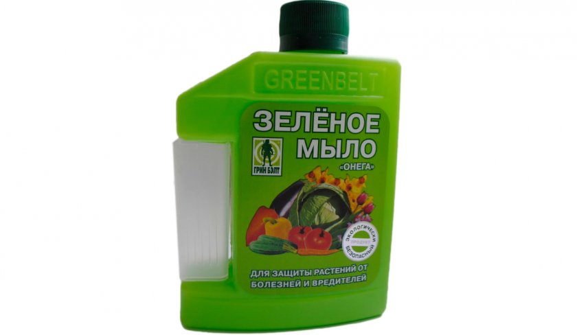 - Зелёное мыло — экологически чистый препарат, созданный на основе калийной соли, жирных кислот и растительных масел. Рабочий раствор готовят из 400 мл препарата и 10 л воды, а затем распрыскивают его над растениями.