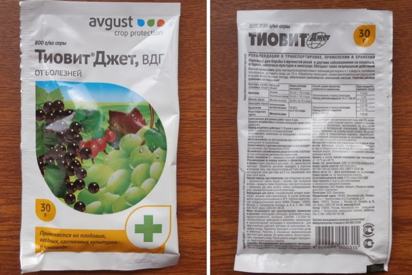 - «Тиовит Джет» — относится к аналогам коллоидной серы. Обладает хорошей растворимостью в воде и высокой контагиозностью (способностью распространяться). Для приготовления рабочего раствора в 10 л воды добавляют 50 г вещества. Проводят опрыскивание по листьям 3-4 раза за весь сезон с интервалом в 20 дней.