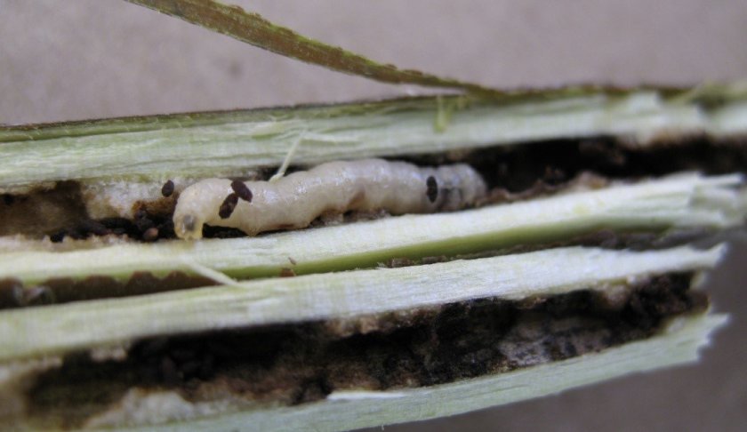 Наибольший вред наносят личинки вредителя, а именно – гусеницы белого или бежевого окраса, которые в длину достигают до 2,5 сантиметра, так как спустя 10 дней после выхода из яиц они уничтожают побеги изнутри. Паразиты, проникая в толщу стебля, питаются им и развиваются. Таким образом, рано или поздно, они достигают сердцевины растения.