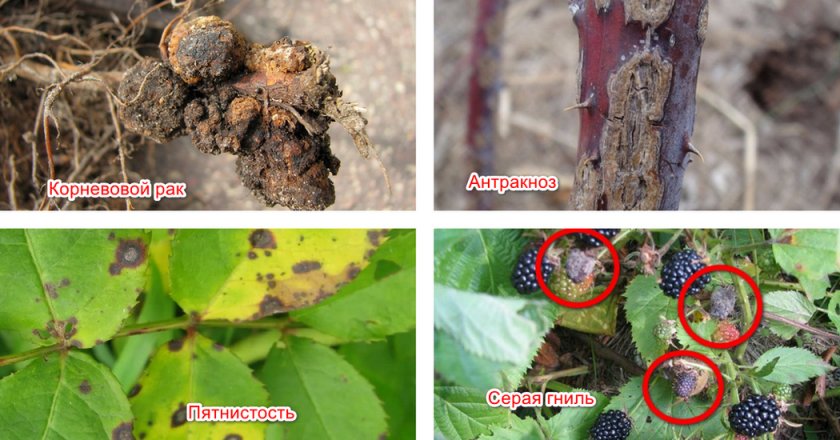 Сделать это необходимо без промедления, так как вирус быстро распространяется и есть возможность потерять всю посадку. Также ежевика может поражаться грибными заболеваниями — антракнозом, пятнистостями, серой гнилью. Грибы поражают листья, побеги, цветы и ягоды. Изначально они меняют цвет, покрываются пятнами, листья и молодая поросль осыпаются. К тому же не развиваются и осыпаются почки и цветы. Серая гниль атакует ягоды — они становятся безвкусными и покрываются серым налётом.