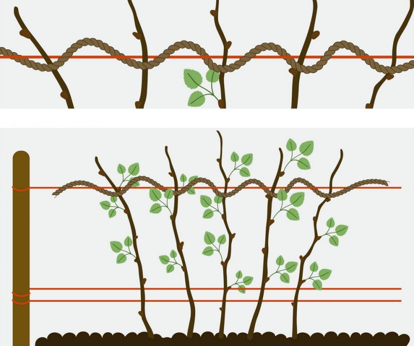 - Необходима установка шпалеры и подвязывание к ней веток малины. Это сооружение будет удерживать стебли и обеспечит доступ к растениям для ухода и сбора ягод. Однополостная шпалера с 2 рядами проволоки или толстой лески подойдёт для этой цели.
