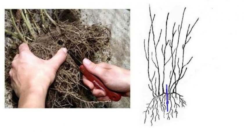 - от старого куста лопатой можно отделить вместе с корнями более молодую часть со стеблями до 1 см в диаметре (их укорачивают до 25 см) и пересадить её на новое место. Такое мероприятие лучше проводить весной;