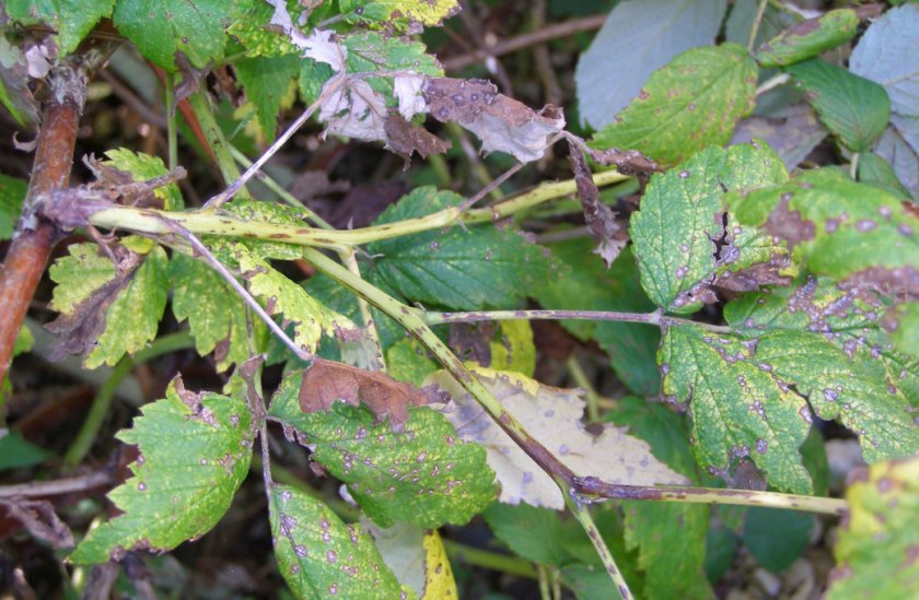 - При недостаточном поливе на всех органах малины возможно образование сероватых пятен с пурпурной каёмкой. Это антракноз. Для лечения применяются опрыскивания 1% бордоской жидкостью с интервалом в 10 дней.