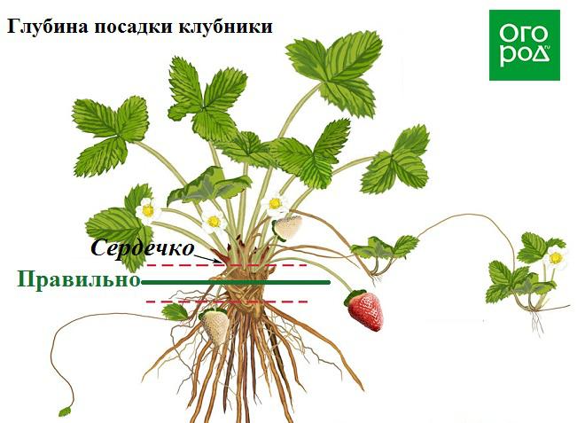 У растения клубники есть так называемое сердечко. Из него растут новые побеги и цветоносы, поэтому заглублять его в грунт нельзя – цветов попросту не будет и, как следствие, клубника не даст урожай.