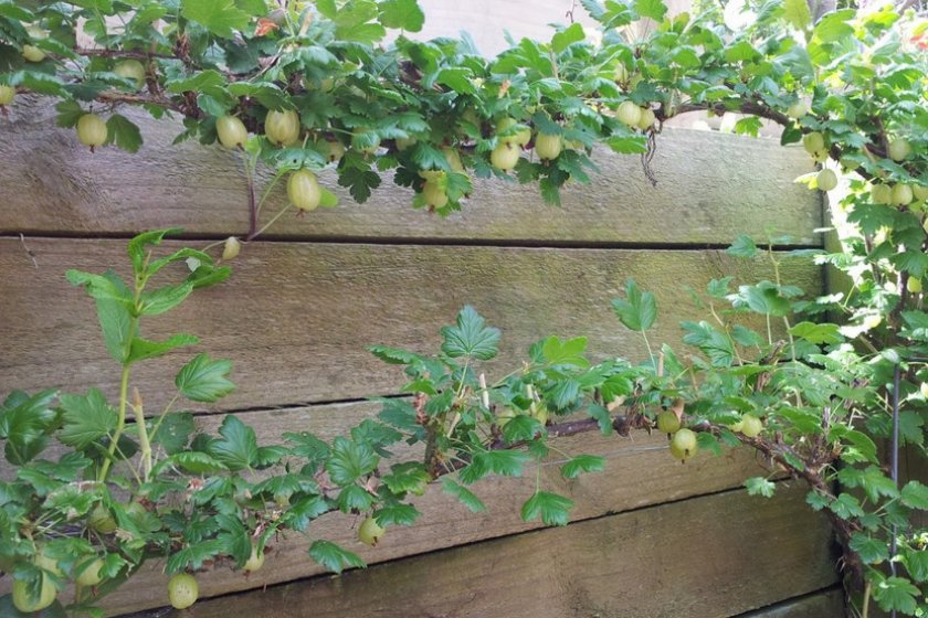 Шпалера. На шпалере выращивают обычно сильнорослые сорта крыжовника. Такое формирование куста позволяет избежать излишнего затенения и комфортно собирать урожай. В первый год роста все побеги крыжовника осенью нужно обрезать на 3 см выше уровня почвы. На второй год необходимо оставить 3-5 самых сильных и рослых побега, остальные удалить. Почки, находящиеся на расстоянии 25 см от земли, необходимо удалить, так как побеги, которые они дадут, приведут к загущению кустарника. Начиная с третьего года роста ветви больше не следует укорачивать, рекомендуют подвязывать их к более высоким ярусам шпалеры. А в семилетнем возрасте кустарник требует прореживания и омолаживающей обрезки (старые плодоносные ветви вырезают до основания, стимулируя рост новых).