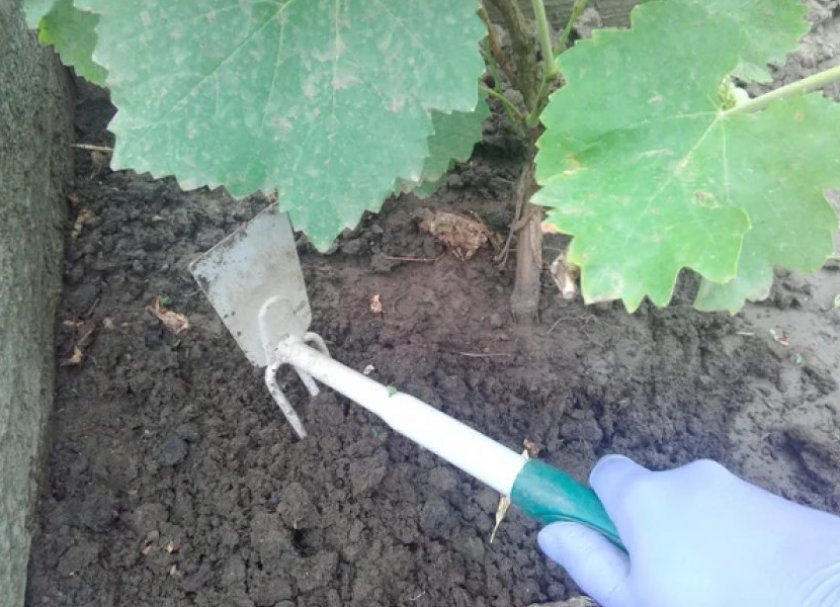 Очень важно, чтобы молодое растение не затерялось в сорняке. На первом году жизни главный уход за виноградником заключается в прополке.